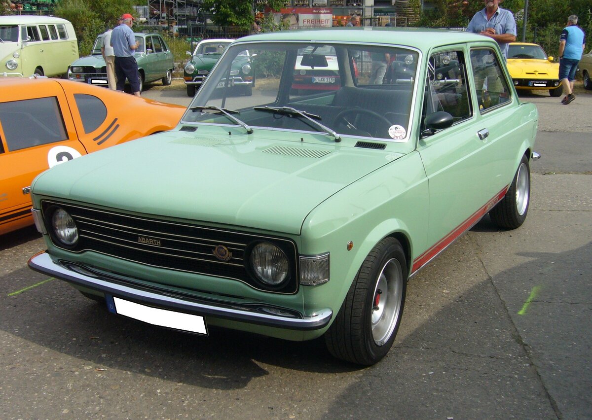Fiat 128. Hinter der Modellbezeichnung 128 verbirgt sich eine umfangreiche Typenreihe mit Karosserien als zwei- oder viertürige Limousine, Kombiwagen und Coupe. Das 1969 vorgestellte Modell war von Anfang an mit zwei Vierzylinderreihenmotoren mit 1.1l und 1.3l Hubraum lieferbar. Des weiteren war es der erste Fiat mit Frontantrieb. Die abgelichtete Limousine ist ein Modell der ersten Serie, wie es von 1971 bis 1974 von den Bändern lief. Oldtimertreffen an der "Alten Dreherei" in Mülheim an der Ruhr am 18.06.2023.
