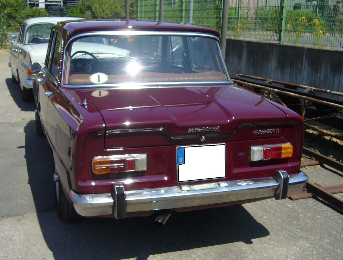 Heckansicht einer Alfa Romeo Giulia 1300ti. Oldtimertreffen an der "Alten Dreherei" in Mülheim an der Ruhr am 17.06.2023.