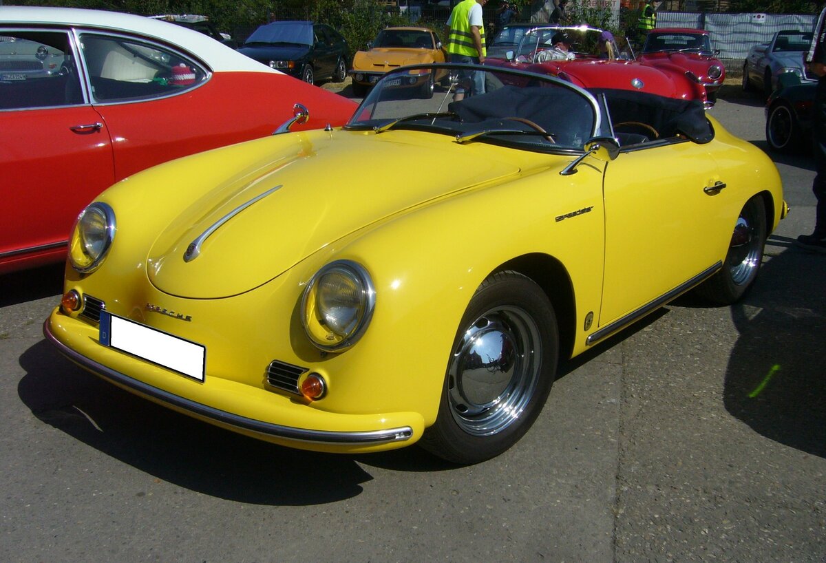 Porsche 356 A Speedster aus dem Jahr 1957. Als Geburtstag des Porsche 356 gilt der 7. Juli 1948, der Tag an dem der erste Testbericht über ein Porsche-Coupé erschien. Im April 1965 endete die Produktion der Baureihe 356 nach insgesamt 76.302 Fahrzeugen (alle Motorisierungen und Karosserieversionen zusammen genommen). Eines der heute begehrtesten Porsche 356 Modelle ist der „Speedster“, der Ende 1954 eingeführt wurde. Der USA-Importeur Max "Maxi" Hoffman hatte Porsche darauf hingewiesen hatte, dass sich eine preiswerte, spartanische Open-Top-Version auf dem USA-Markt gut verkaufen könnte. Mit seiner niedrigen, geneigten Windschutzscheibe, die abgenommen werden konnte, den Schalensitzen und dem Notverdeck war der Speedster vor allem in den südlichen US-Bundesstaaten ein Verkaufserfolg. Sein Preis von knapp US$ 3000,00 trug dazu bei, den Speedster aus den Ausstellungsräumen auf die Straße zu bringen. Der im Heck verbaute, gebläsegekühlte, Vierzylinderboxermotor hat einen Hubraum von 1582 cm³ und leistet in diesem Fahrzeug 75 PS. Oldtimertreffen an der "Alten Dreherei" in Mülheim an der Ruhr am 17.06.2023.