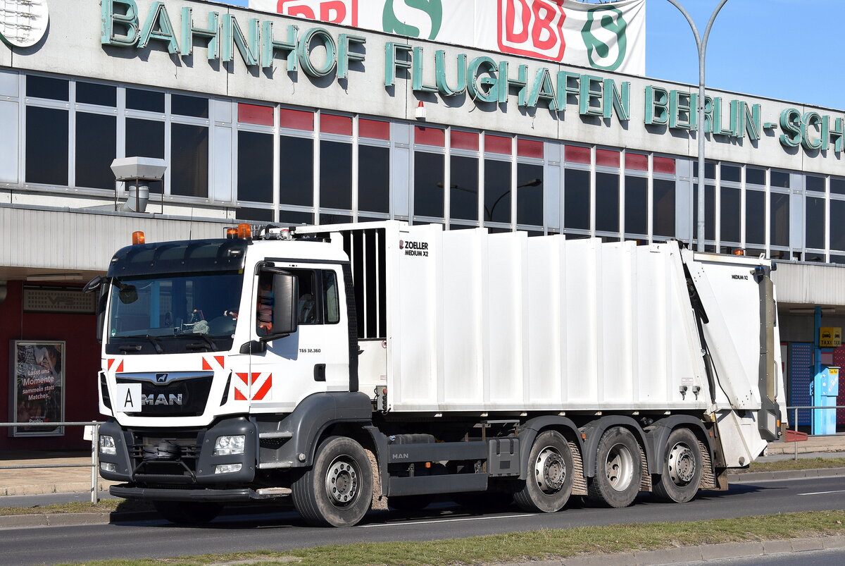 Ein MAN TGS 32.360 Müllentsorgungsfahrzeug mit ZOELLER MEDIUM X2 Müllpresse am 01.03.23 Bahnhof Flughafen Berlin Schönefeld.