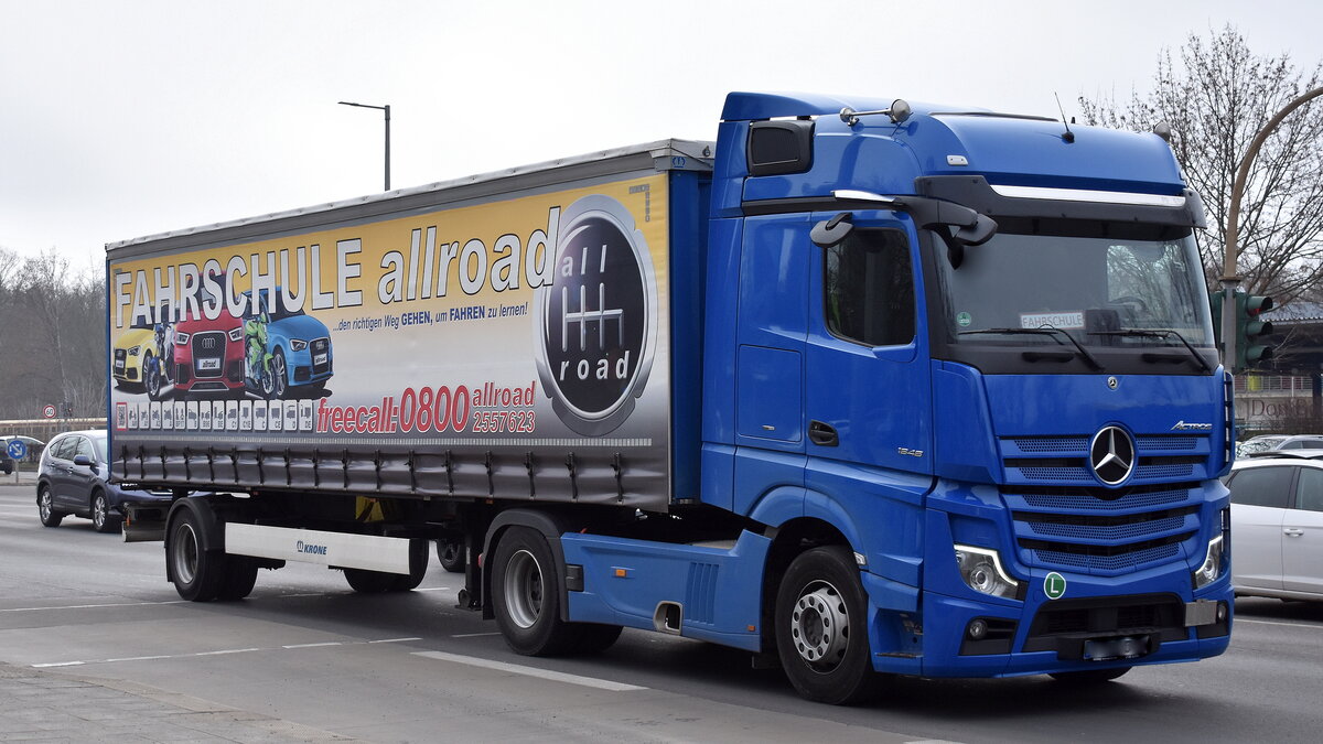 Eine Berliner Fahrschule mit einem Sattelzug mit MB ACTROS 1848 Zugmaschine am 02.03.23 Berlin Marzahn.