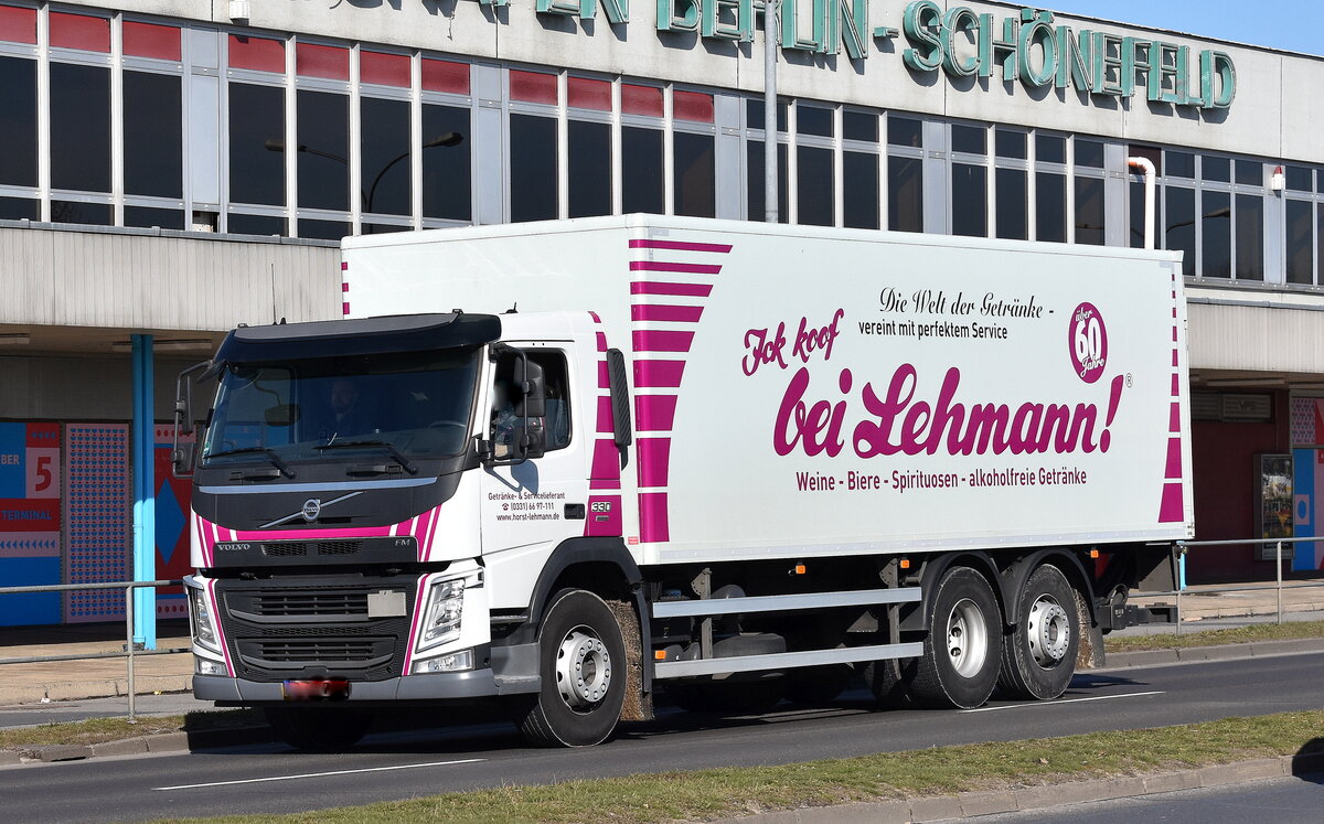 HORST LEHMANN GETRÄNKE GMBH mit einem VOLVO FM 330 EURO6 mit Kastenaufbau am 01.03.23 Bahnhof Flughafen Berlin Schönefeld.