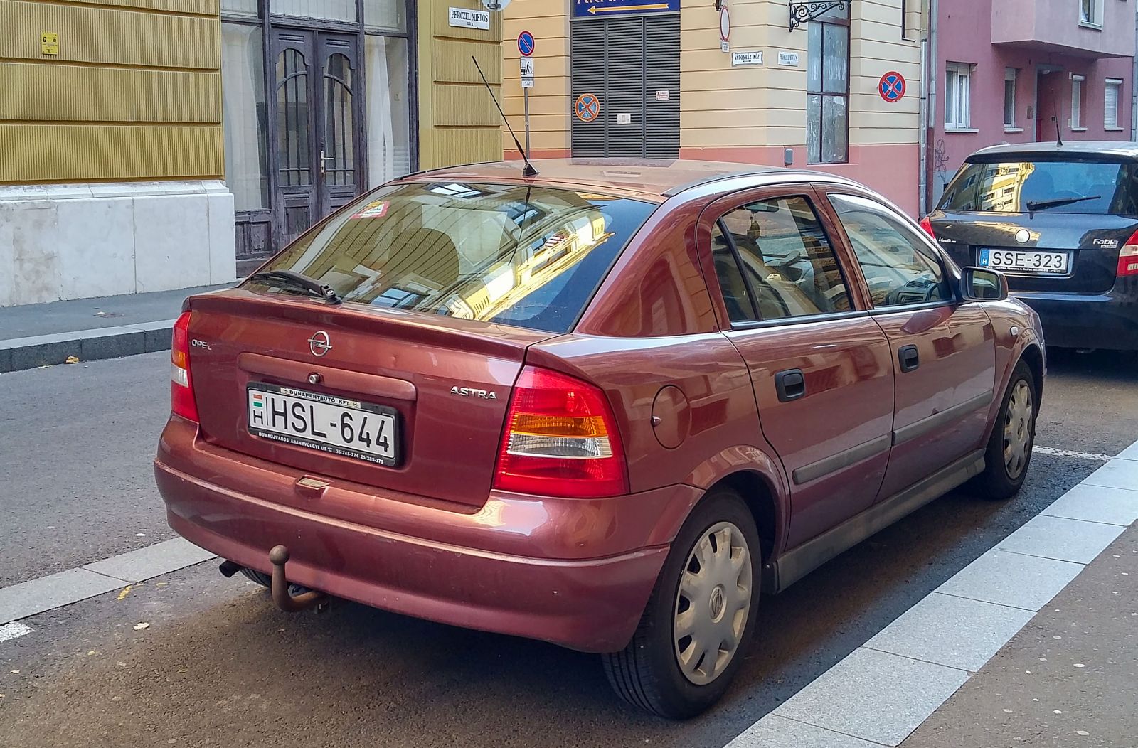 Rückansicht: Opel Astra G in Barolo Rot. Foto: Oktober, 2021.