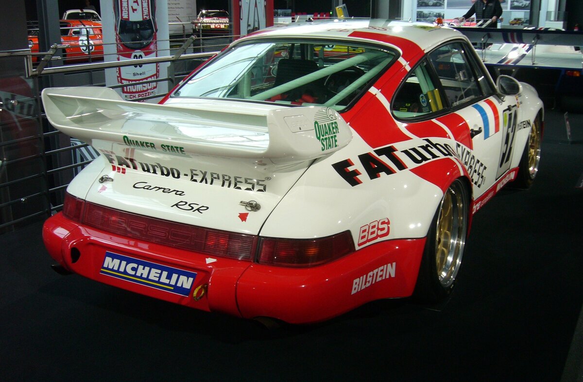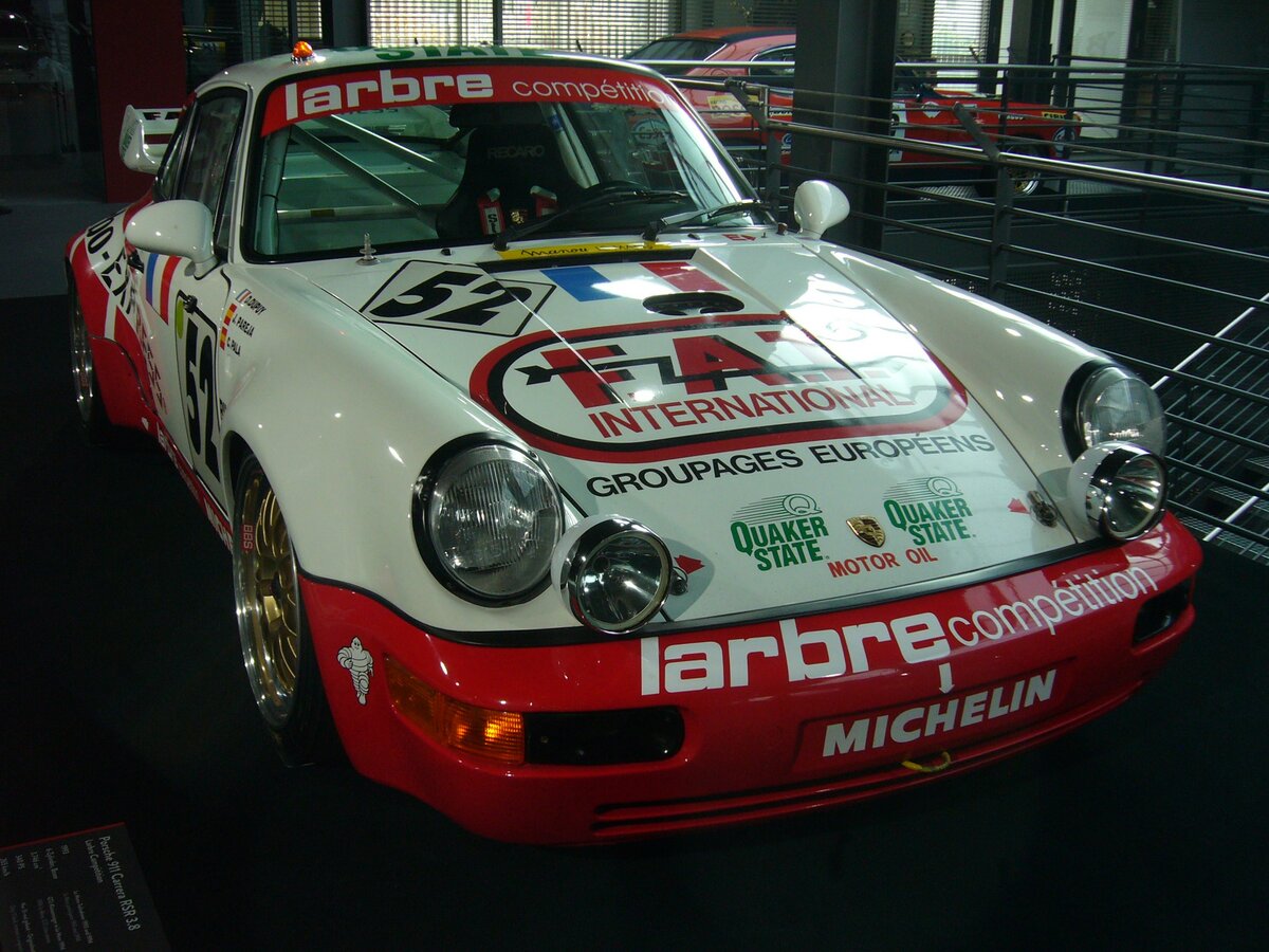Porsche 911 Carrera RSR 3.8 des Teams Larbre Compétition aus dem Jahr 1993. Das Rennteam aus dem französischen Ort Le Vigeant ist seit dem Jahr 1988 in verschiedenen Rennserien, wie z.B. LeMans und Porsche Carrera Cup, aktiv. Der gezeigte Wagen fuhr in den Jahren 1993 und 1994 bei den 24 Stunden von LeMans mit. Fahrer waren der Franzose Dominique Dupuy (*1957) sowie den Spaniern Jesus Pareja (*1955) und C. Pala. Im Jahr 1994 wurde dieses Auto Klassensieger in der Gruppe GT2. Insgesamt wurden nur 51 Fahrzeuge dieses Typs hergestellt. Der im Heck verbaute Sechszylinderboxermotor hat einen Hubraum von 3746 cm³ und leistet 340 PS. Nationales Automuseum/Loh Collection am 08.11.2023.