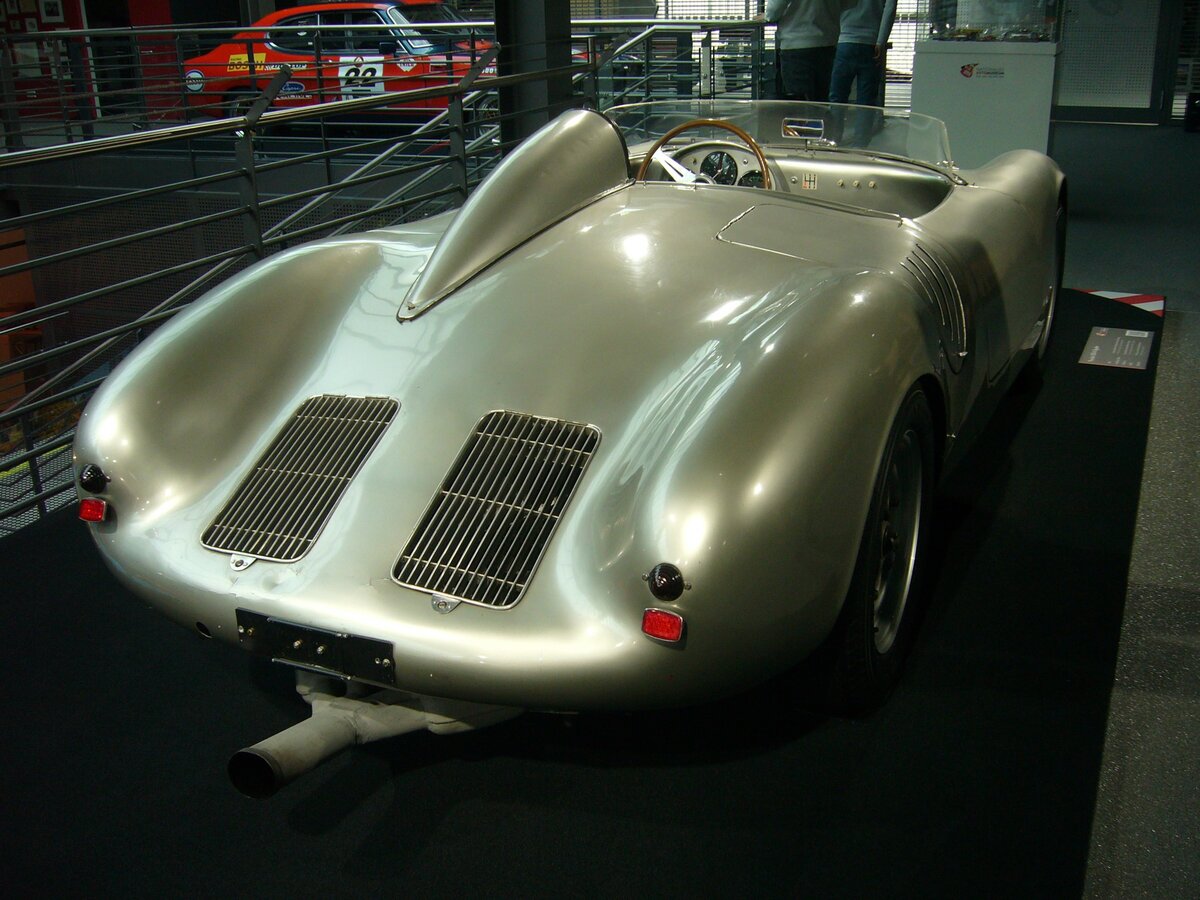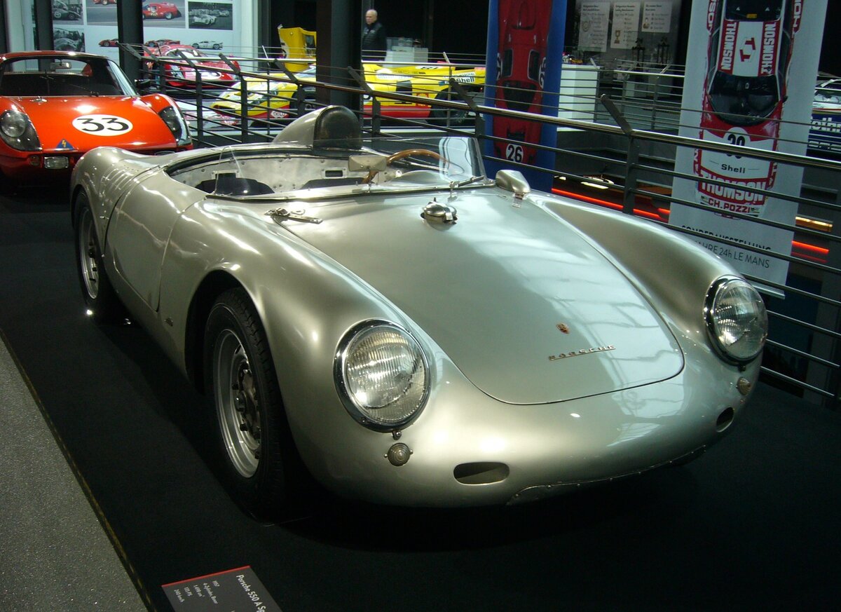Porsche 550 A Spyder aus dem Jahr 1957. Dieser Porsche 550 A Spyder nahm am 24 Stunden Rennen von LeMans im Jahr 1957 teil. Pilotiert wurde der Wagen von den beiden deutschen Fahrern Hans Herrmann (*1928) und Richard von Frankenberg (*1922 +1973). Über eine Platzierung auf den vorderen Rängen dieses Rennens ist leider nichts bekannt. Später wurde der Wagen an den weltbekannten Dirigenten Herbert von Karajan (*1908 +1989), der ein großer Porsche Liebhaber war, verkauft. Der im Heck verbaute, luftgekühlte, Vierzylinderboxermotor hat einen Hubraum von 1498 cm³ und leistet 135 PS. Angeblich waren Spitzengeschwindigkeiten von bis zu 240 km/h möglich. Nationales Automuseum/Loh Collection am 08.11.2023.