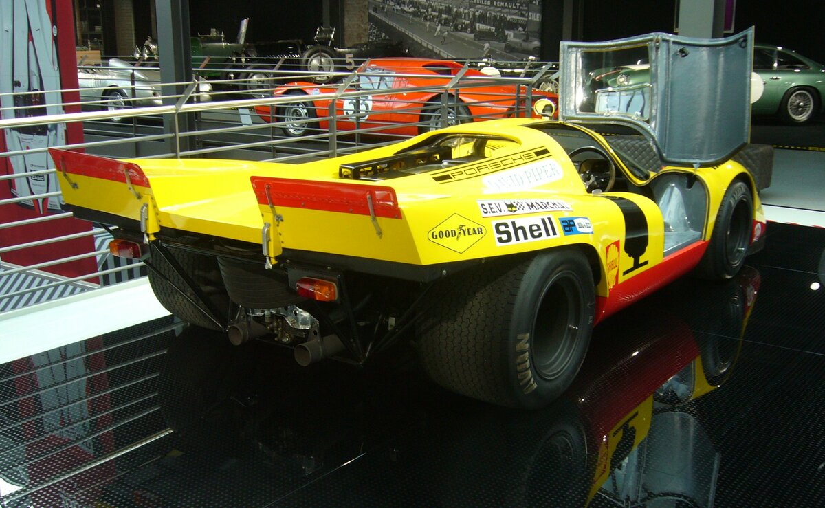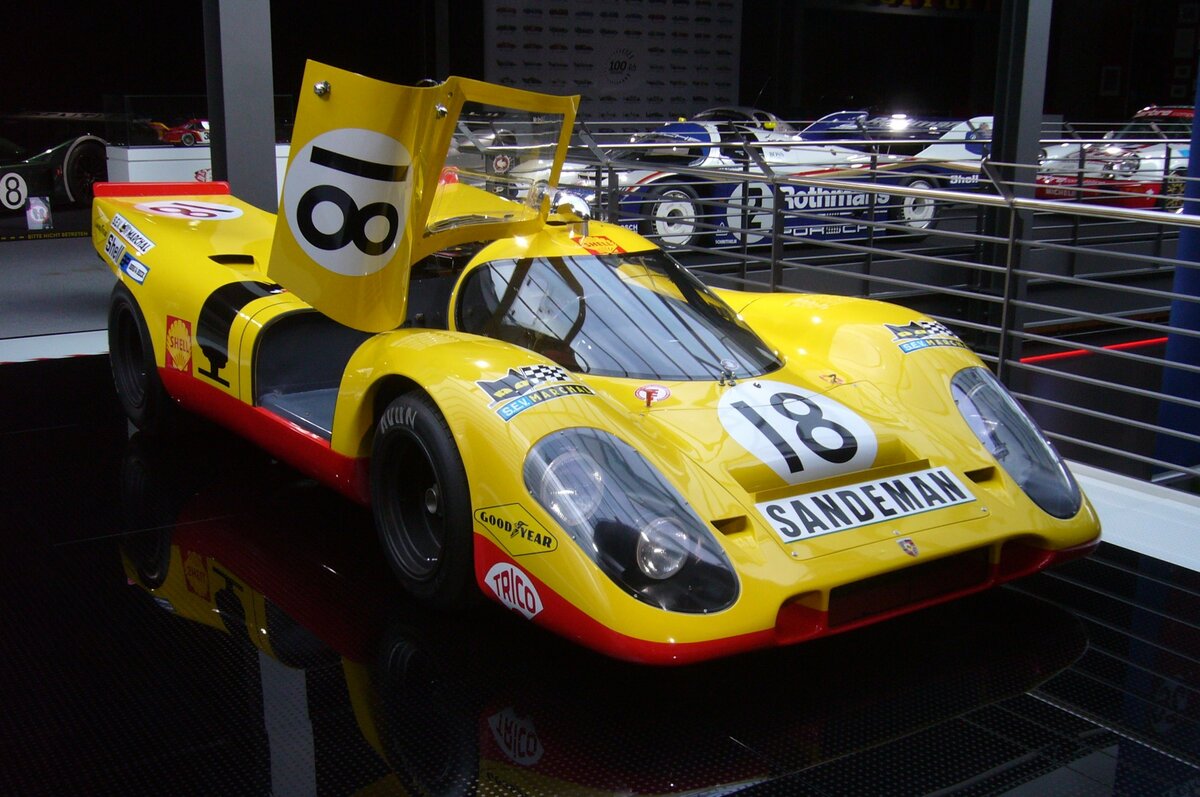 Porsche 917 K aus dem Jahr 1969. Ein solcher Porsche 917 holte bei den LeMans Rennen der Jahre 1970 und 1971 einen Doppelsieg. Fahrer waren der Niederländer Gijsbert „Gijs“ van Lennep (*1942) und der Engländer David Piper (*1930). Der V12-Motor hat einen Hubraum von 4907 cm³ und leistet 600 PS. Beim Rennen wurde eine Geschwindigkeit von 340 km/h gemessen. Nationales Automuseum/Loh Collection am 08.11.2023.