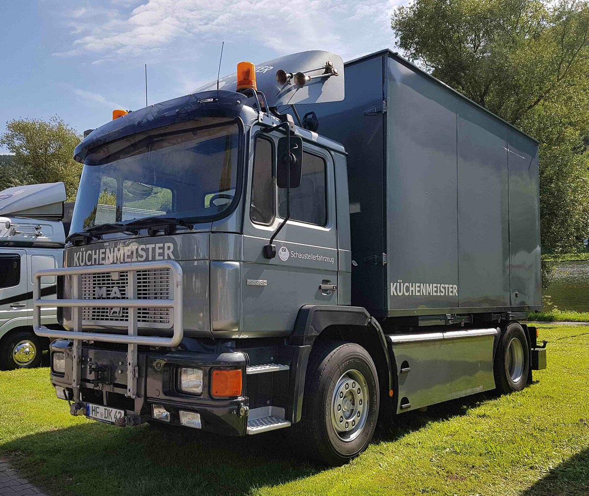 =MAN des Schaustellerbetriebes KÜCHENMEISTER steht auf dem Weinfestgelände von Bernkastel-Kues, 08-2023