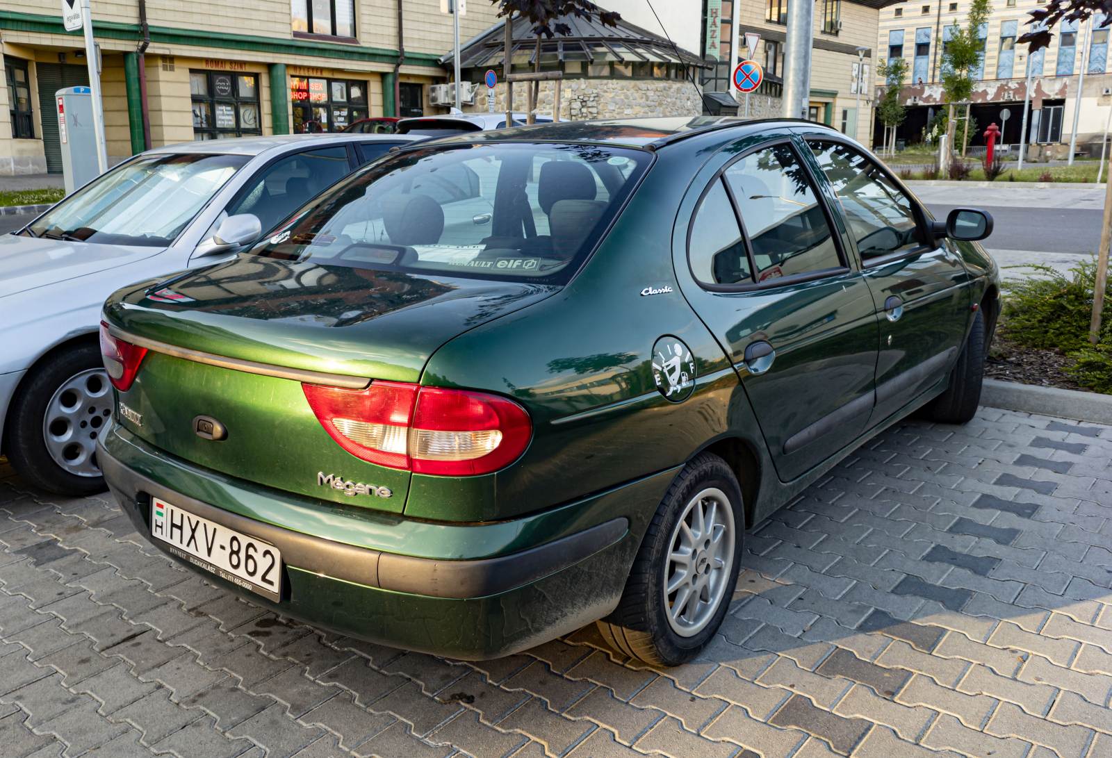 Rückansicht: dunkelgrüner Renaul Mégane Classic (Sedan der ersten Generation). Foto: 06.2022.