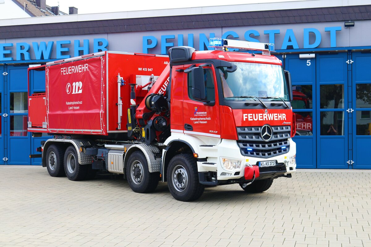 Feuerwehr Pfungstadt Mercedes Benz Arocs WLF-Kats (Florian Pfungstadt 1-67-1) mit dem AB-Kran am 12.08.23 bei einen Fototermin mit dem neuen Design. Danke für das tolle Shooting