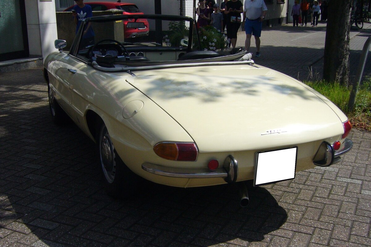 Alfa Romeo Giulia 1.3 Super im Farbton bianco, gebaut in den Jahren von 1964 bis 1971. Um, die im Jahr 1962 vorgestellte Giulia, auch weniger betuchten Kunden zugänglich zu machen (billig war die Giulia ja nie), bot man ab 1964 diese spartanischer ausgestattete Version mit einem 1.3l Motor an. Der Vierzylinderreihenmotor mit Doppelnockenwellen hat einen Hubraum von 1290 cm³ und leistet zwischen 85 PS und 89 PS. 10. Saarner Oldtimer Cup am 27.08.2023 in Mülheim an der Ruhr.