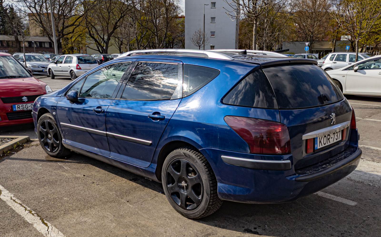 Rückansicht / Seitenansicht: Peugeot 407 SW in Aegean Blue. Foto: März, 2022.