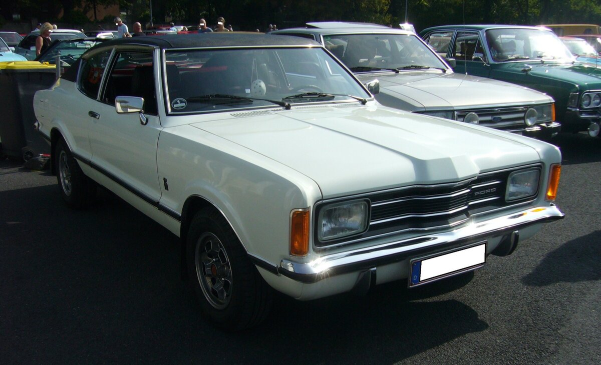 Ford Taunus TC Coupe 1.6 GXL im Farbton diamantweiß. Gebaut wurde das Modell von 1970 bis 1975. Während die Ausstattungsvariante 1.6l XL aus einem Hubraum von 1576 cm³ 72 PS leistete, kam die luxuriösere GXL-Version durch die Bestückung mit einem Weber 32/38 Fallstromvergaser auf eine Leistung von 88 PS. 9. Ford-Classic-Event an Mo´s Bikertreff in Krefeld am 03.09.2023.