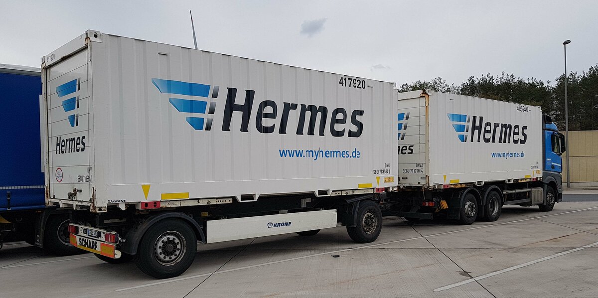 =MB Actros-Hängerzug der Spedition SCHARF ist unterwegs für Hermes, 04-2023