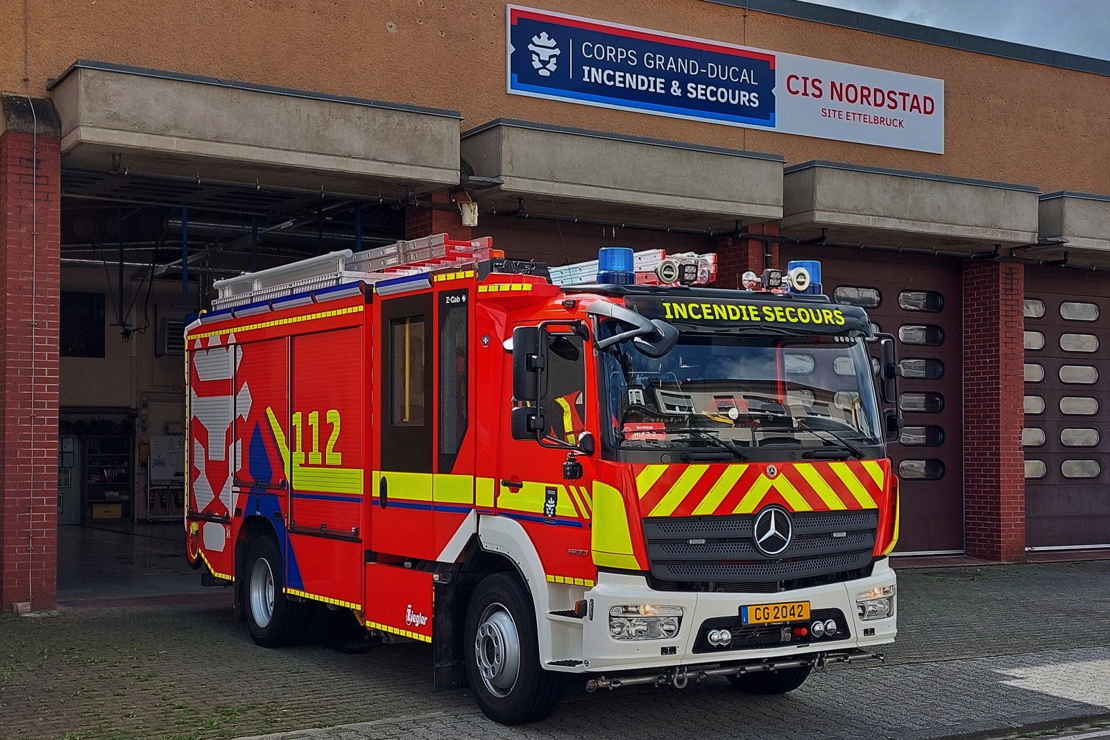 Mercedes Benz Hilfeleistungslöschgruppenfahrzeug (HLF) aufgenommen vor der Feuerwehrkaserne in Ettelbrück. 09.2023