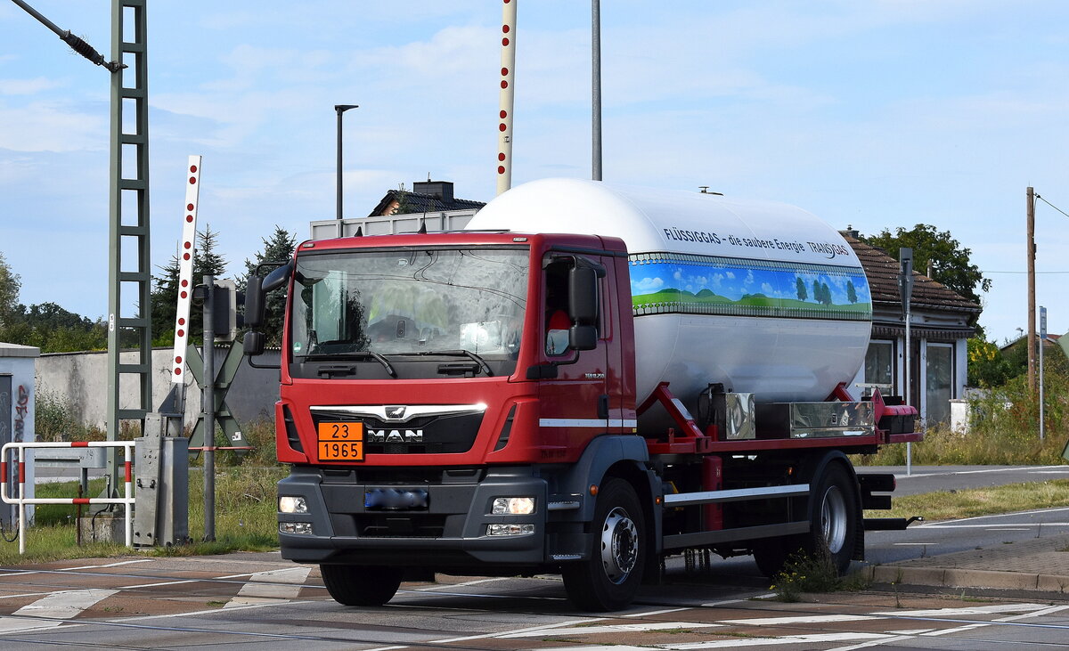 Transgas Flüssiggas Transport und Logistik GmbH & Co. KG mit einem MAN TGM 18.250 Flüssiggastank-LKW (UN-Nr.: 23/1965 = Kohlenwasserstoffgas, Gemische, verflüssigt, N.A.G.) am 21.09.23 Höhe Bahnübergang Bahnhof Rodleben.