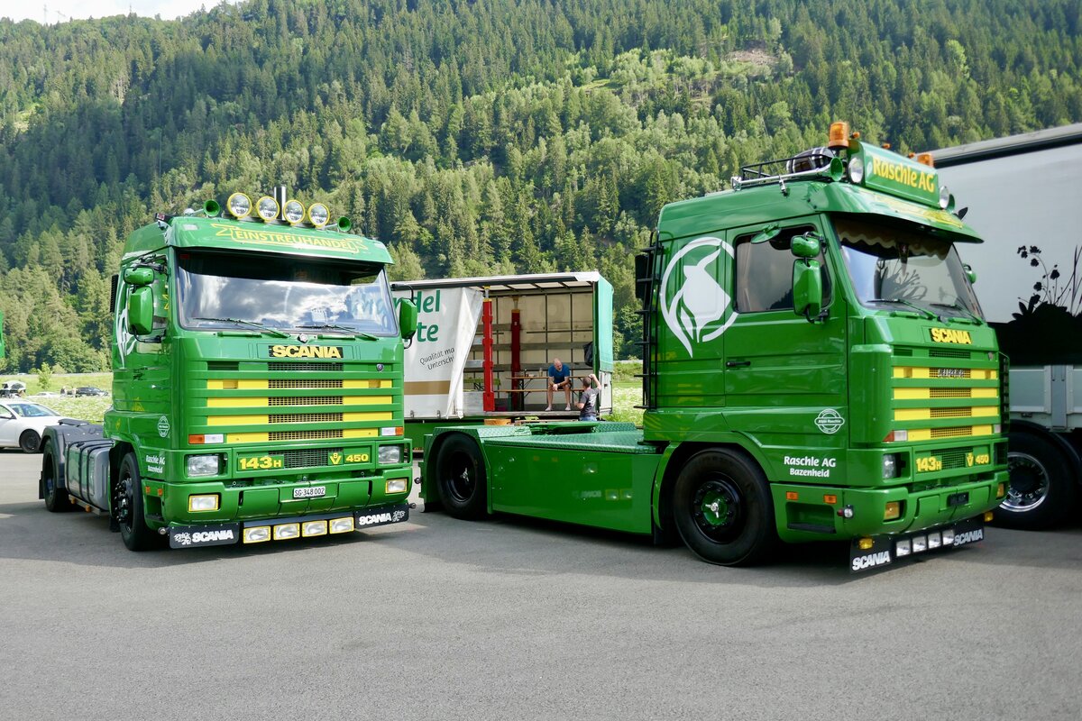 Die zwei älteren Scania Zugmaschinen von Raschle AG die am 14.7.24 beim Trucker Treffen in Ambri stehen.