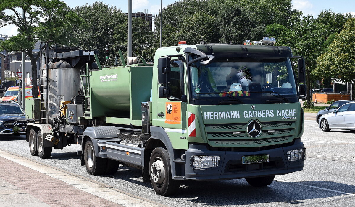 Garbers Hermann Nachf. Heinz Garbers GmbH aus Hamburg mit einem MB ATEGO 1530 LKW mit abnehmbarer Mulde u. Asphaltkocher als Hänger am 15.07.24 Hamburg Harburg.