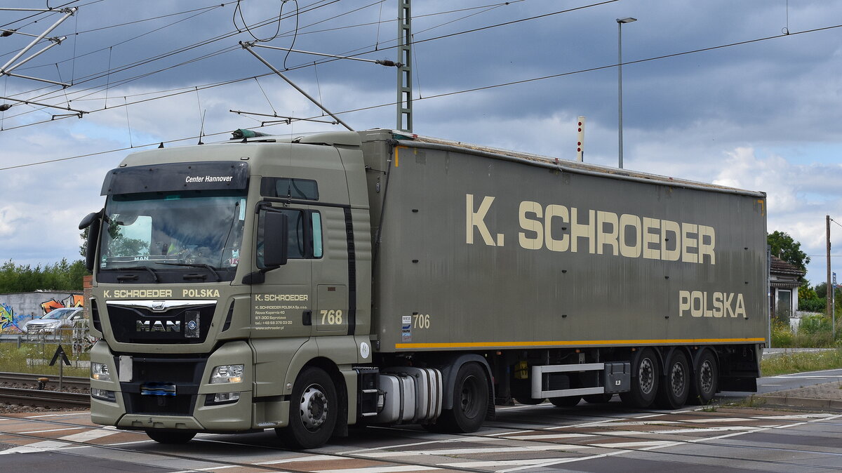 K. Schroeder Polska Sp. z o.o. (Polen) mit einem Sattelzug mit MAN TGX Zugmaschine am 17.07.24 Bahnübergang Rodleben.
