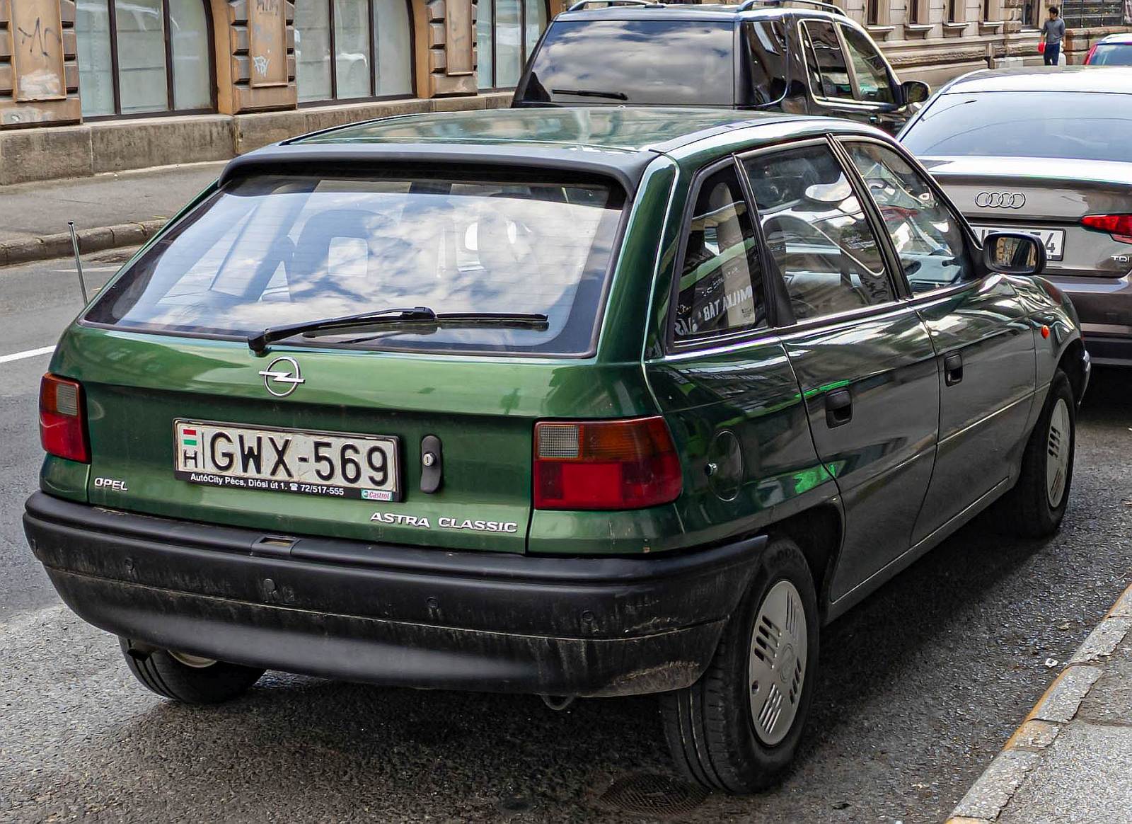 Diesen Schrägheck Opel Astra F (Farbe: Rio Verde) habe ich in April, 2024 fotografiert.