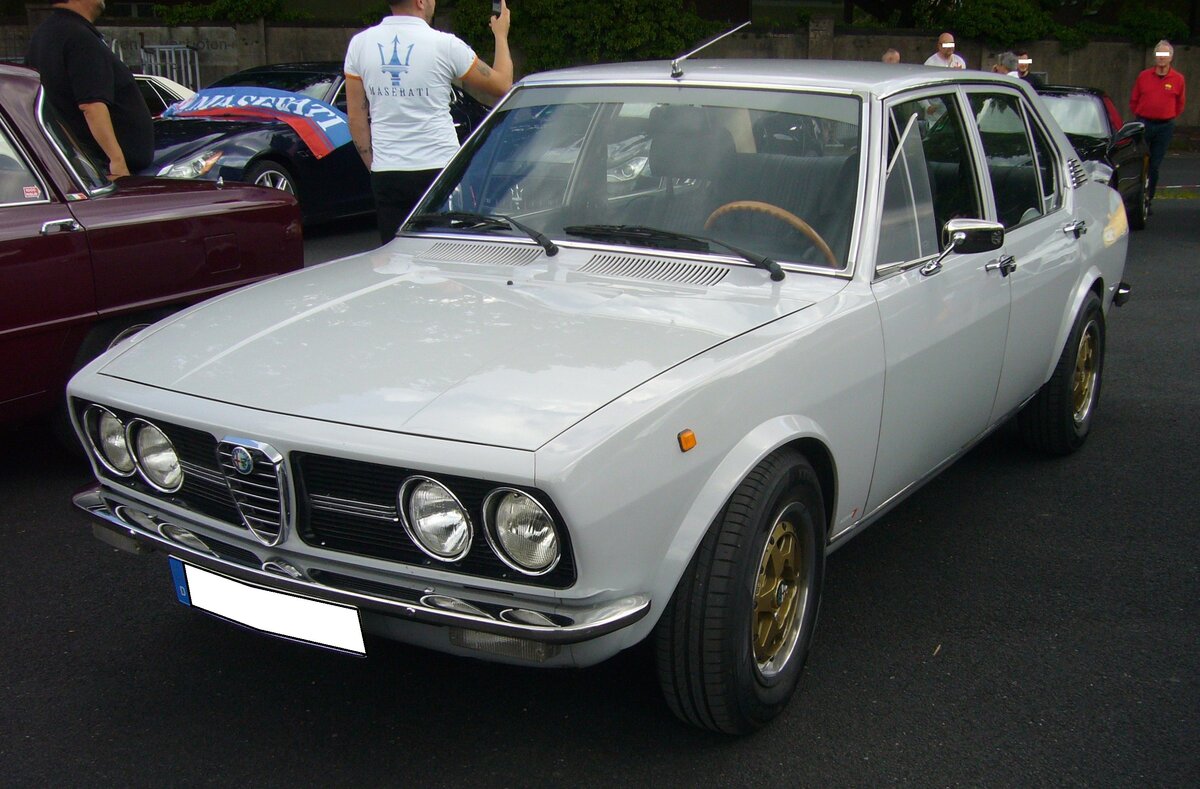 Alfa Romeo Alfetta, gebaut in den Jahren von 1972 bis 1984. Alfetta = Kleiner Alfa, so hießen schon in den 1950er Jahren die Rennwagen von Alfa Romeo. Auch diese viertürige Alfa Romeo Limousine hatte sportliches Temperament. Hier wurde ein Modell bis Baujahr 1977 abgelichtet. Dieses ist an den runden Frontscheinwerfern zu erkennen. Die Alfetta war in etlichen Motorisierungen als Benziner oder Dieselfahrzeug lieferbar. Der hier gezeigte Wagen ist eine Alfetta 1.6. Der Vierzylinderreihenmotor hat einen Hubraum von 1570 cm³ und leistet 108 PS. "Forza Italia" = Oldtimertreffen für italienische Fahrzeuge am 30.05.2024 an Mo´s Bikertreff in Krefeld.