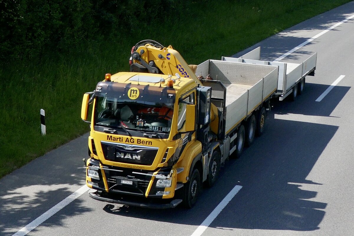 Ein MAN Hängerzug von Marti AG Bern am 28.6.24 auf der A8 in Matten b. Interlaken.