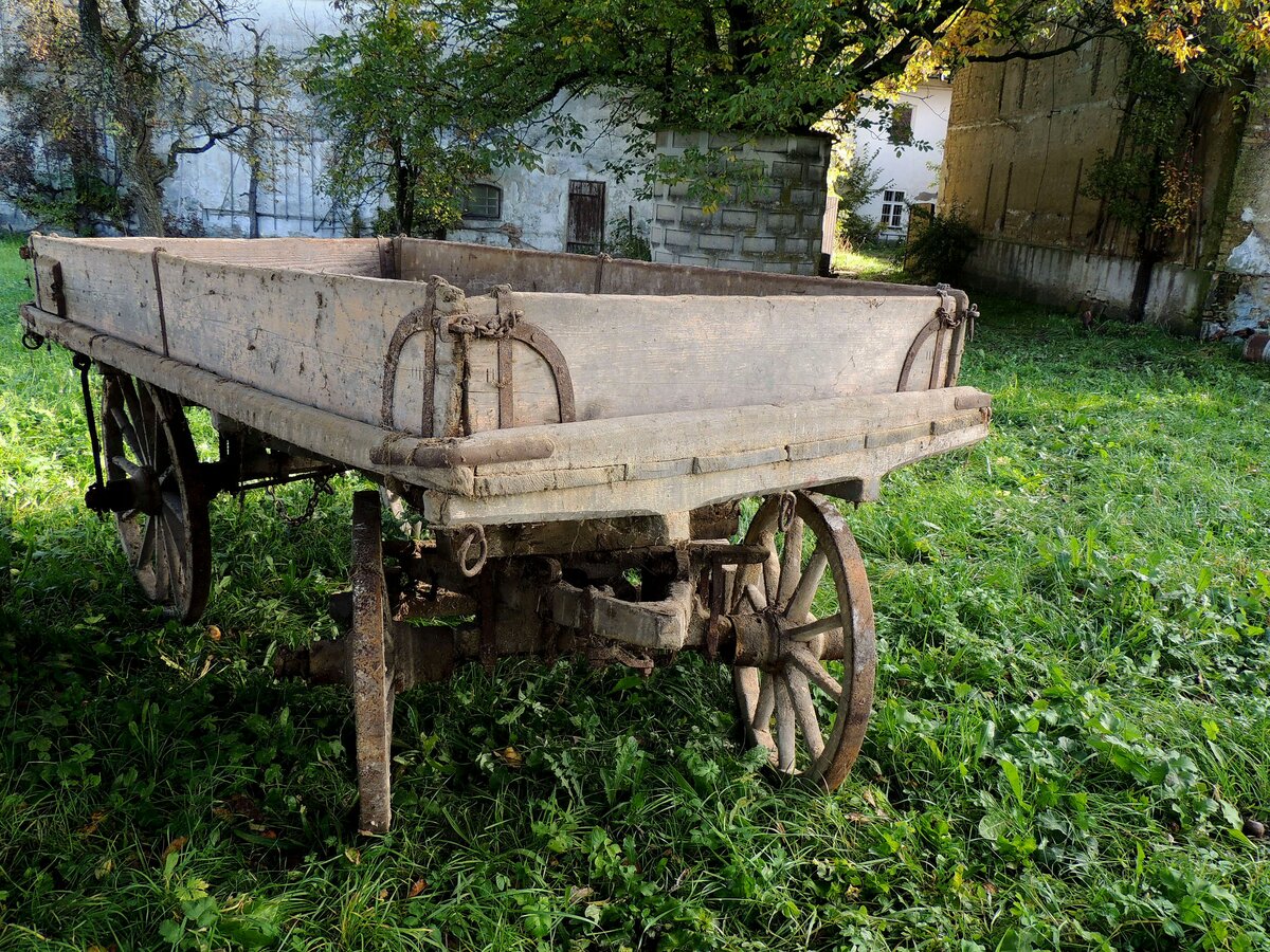 alter Holzwagen (ohne-deichsel) wurde auf einer herbstlichen Wiese abgestellt; 161022