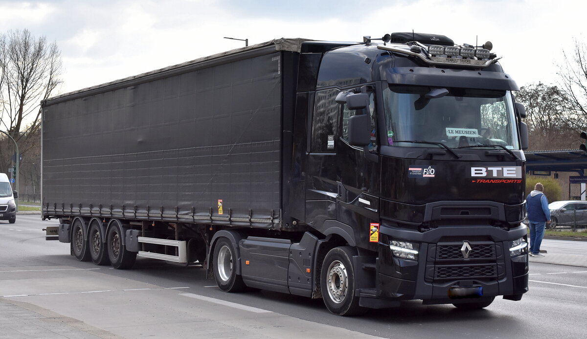 Französicher Sattelzug "BTE TRANSPORTS" mit Renault T Truck Zugmaschine am 12.03.24 Berlin Marzahn.