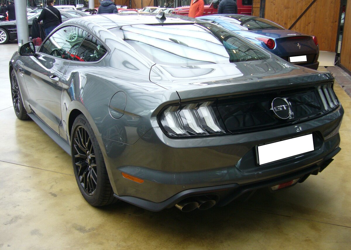 Heckansicht eines Ford Mustang 5.0 Coupe aus dem Jahr 2022. Classic Remise Düsseldorf am 26.02.2024.