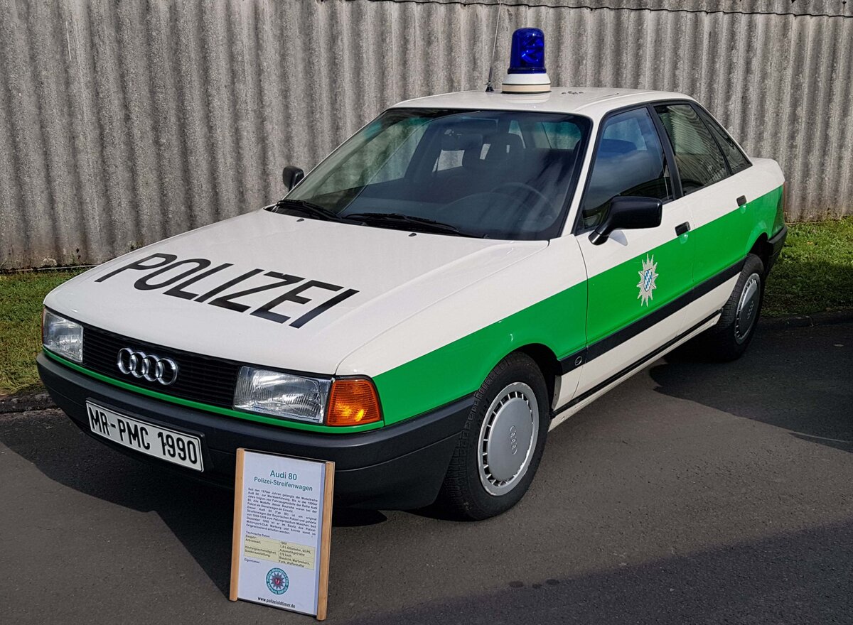 =Audi 80, ehemaliges Einsatzfahrzeug des Polizeipräsidium München, ausgestellt im Polizei-Oldtimer-Museum Marburg, Oktober 2023