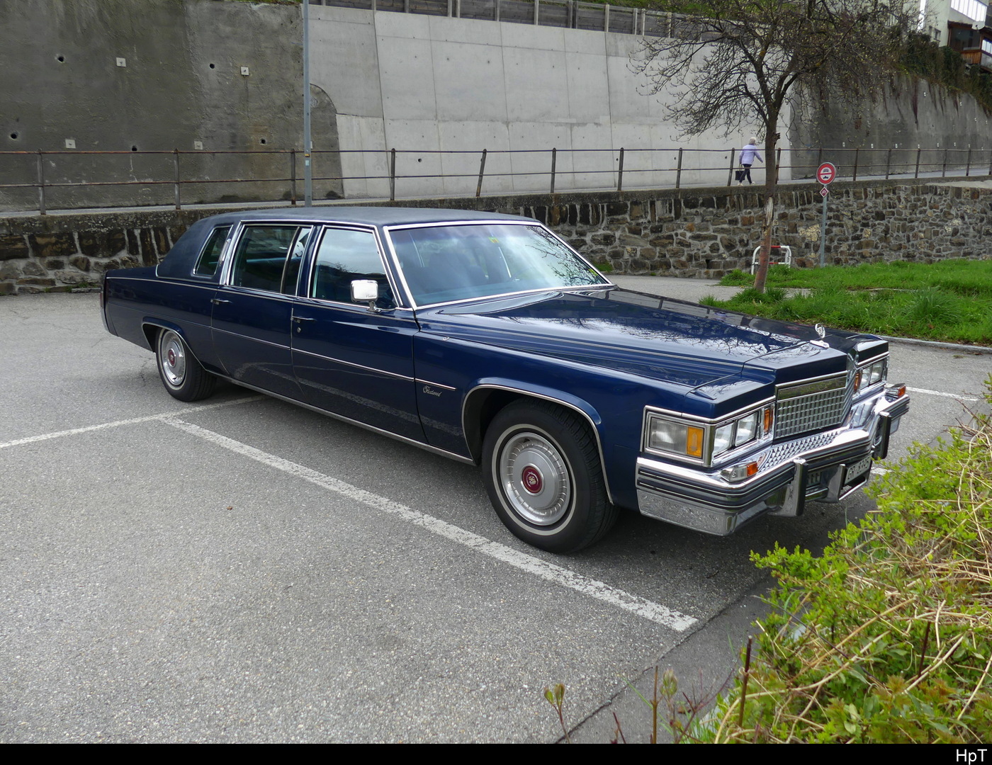 Oldtimer Cadillac Fleetwood auf dem Bahnhof Parkplatz in Thusis am 29.03.2024