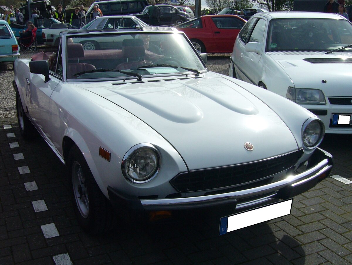 Fiat 124 Spider der Modelljahre 1980 bis 1985. In seiner Urform wurde der 124 Spider bereits 1966 vorgestellt und auch bis 1975 in Deutschland verkauft. Erst ab 1980 erschien das Modell wieder in den Schaufenstern der Händler. Hier wurde ein US-Modell, erkennbar an den seitlichen Begrenzungsleuchten, abgelichtet. Der Vierzylinderreihenmotor leistet 105 PS aus einem Hubraum von 1995 cm³. Oldtimertreffen beim Autohaus Voss in Rosendahl-Darfeld am 07.04.2024.