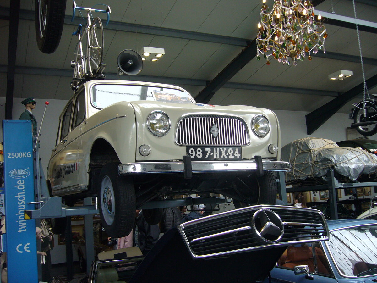 Hier steht ein R4 der ersten Serie, wie er von 1961 bis 1966 gebaut wurde auf der Hebebühne. Der Vierzylinderreihenmotor hat einen Hubraum von 747 cm³ und leistet 24 PS. Dieser R4 verbrachte gemäß des alten französischen Kennzeichens seine Autojugend im Department Dordogne. Oldtimertreffen beim Autohaus Voss in Rosendahl-Darfeld am 07.04.2024.