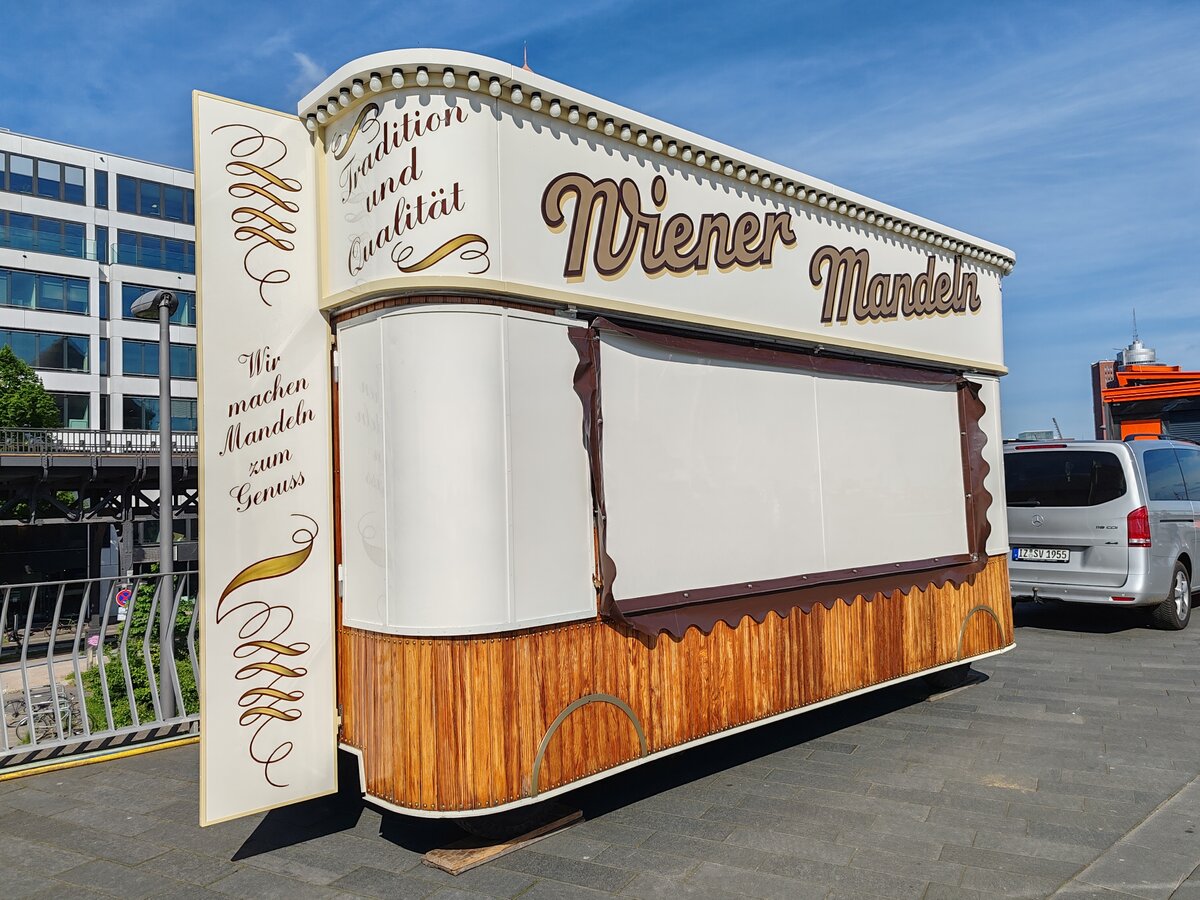 =Verkaufsanhänger von WIENER MANDELN steht bereit zum Hamburger Hafenfest, 05-2024