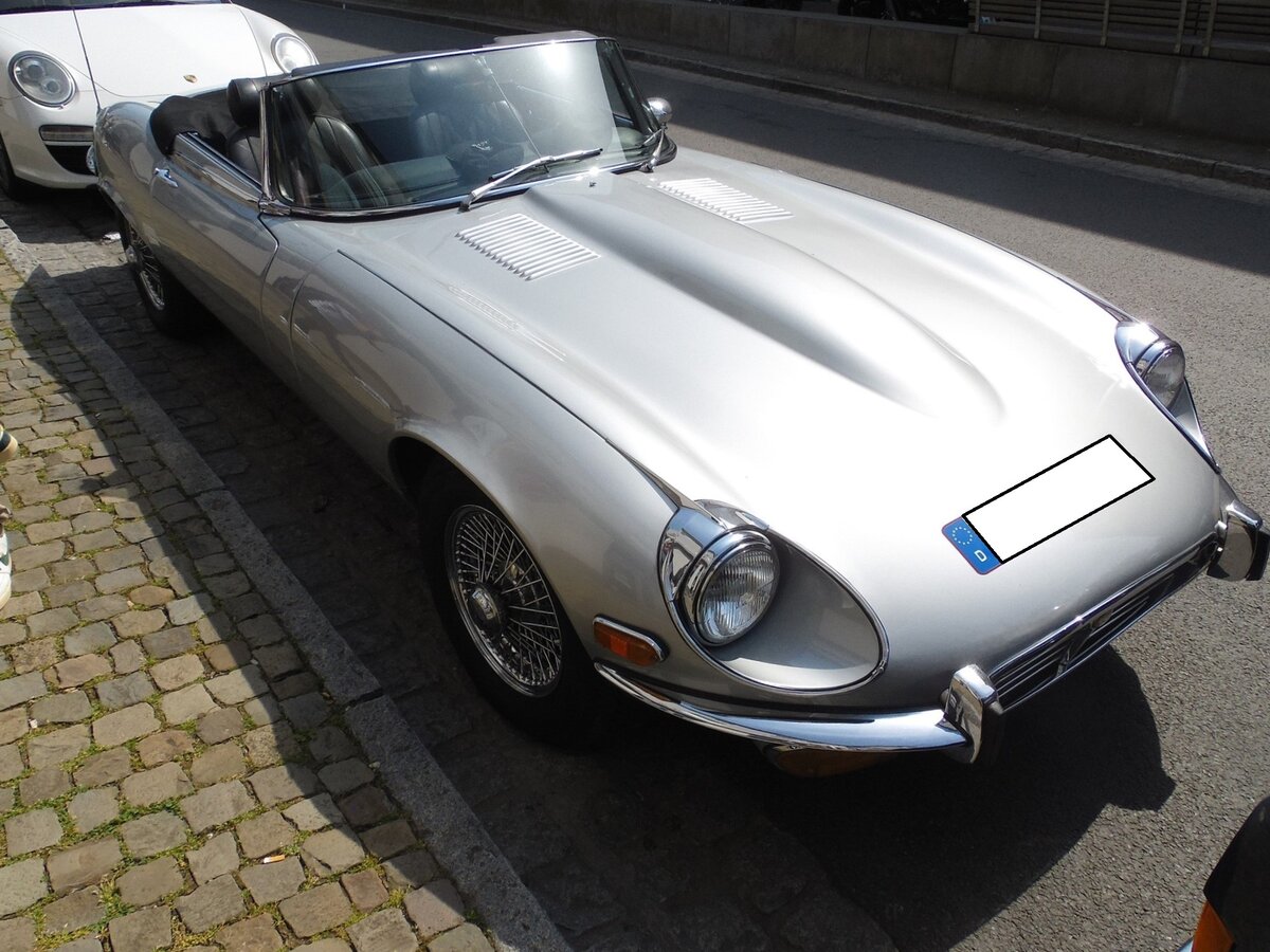 Jaguar E-Type Series 3 Roadster. Der E Type, ein Klassiker par excellence im Farbton silver grey in der US-Ausführung. Vorgestellt wurde das Modell auf dem Genfer Salon des Jahres 1961. Wie schon 13 Jahre zuvor der XK120 stieß auch der E Type in der Fachpresse auf einhellige Begeisterung. Sowohl Cabriolet, als auch das FHC (Fixed Head Coupe) genannte, geschlossene Modell waren sofort der Traumwagen der breiten, automobilen Masse. Die Series 3 Modelle waren die letzte Baureihe des legendären Jaguar E-Type und wurden von 1971 bis 1974 produziert. Der V12-Motor leistet 267 PS aus einem Hubraum von 5343 cm³. 16. Oldtimertreffen des ACK am 01.05.2024 in Essen-Kettwig.