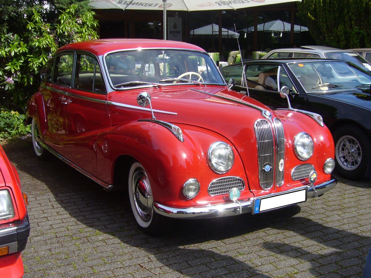 BMW 502 3200 S, gebaut von September 1961 bis August 1962. Der 3200 S war die stärkste Version und letzte Ausbaustufe des BMW 502. Insgesamt verließen während seiner Produktionszeit nur 915 Fahrzeuge dieses Typs die Werkshallen der BMW AG. Der abgelichtete 3200 S wurde im Mai 1962 ausgeliefert und kostete damals DM 19.850,00. Der V8-Motor dieses Autos hat einen Hubraum von 3168 cm³ und leistet 140 PS. Die Höchstgeschwindigkeit gaben die Münchener mit 175 km/h an. Oldtimertreffen an der Burgruine in Essen-Burgaltendorf am 26.05.2024.