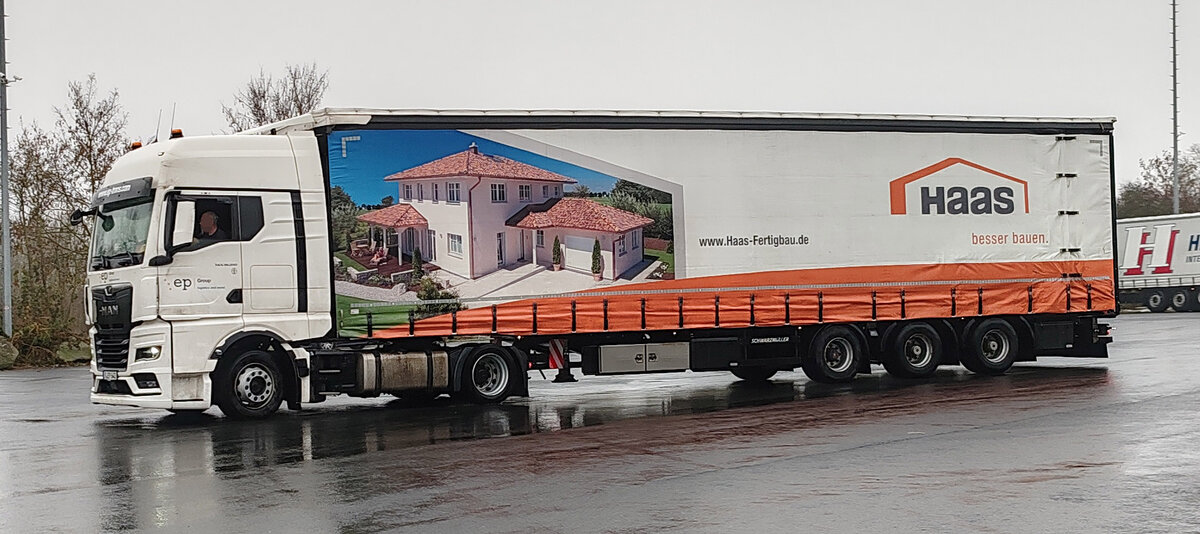 =MAN-Sattelzug von EP-Group mit einem Auflieger des Fertighausherstellers HAAS, 12-2023