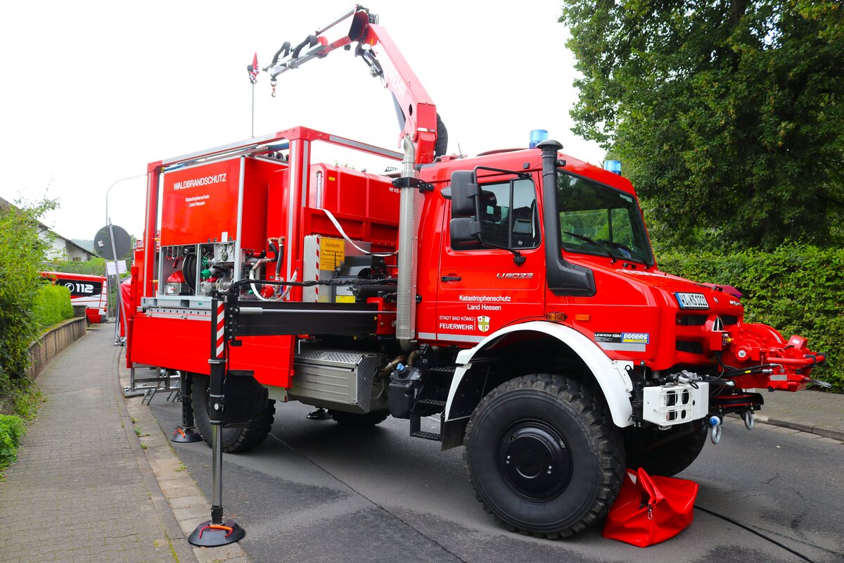 Feuerwehr Bad König (Odenwald) Mercedes Benz Unimog U5023 GW-L Kats mit den einzelnen Modulen am 18.08.24 beim Kreisfeuerwehrtag in Reichelsheim