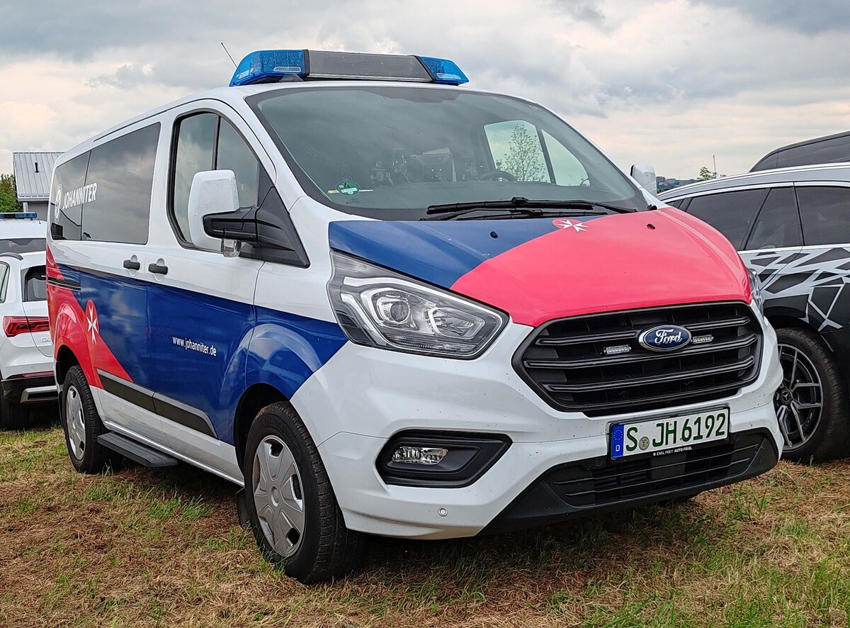 =Ford Transit Custom der JOHANNITER, gesehen auf dem Parkplatzgelände der RettMobil 2024 in Fulda