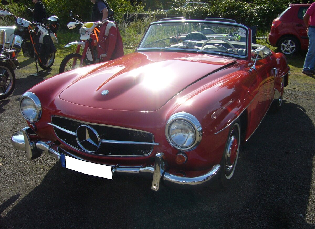 Mercedes Benz W121 BII, gebaut in den Jahren von 1955 bis 1963. Dieser Sportwagen ist besser bekannt unter der Typenbezeichnung 190SL. Genau 25.881 Fahrzeuge dieses Typs verließen die Werkshallen von Mercedes Benz. Dieser 190 SL ist im Farbton tarragonarot lackiert. Der Vierzylinderreihenmotor mit einem Hubraum von 1897 cm³ leistet 105 PS. Für einen solchen "Wirtschaftswunder-Sportwagen" war mindestens ein Kaufpreis von DM 16.500,00 fällig. Ab September 1959 konnte der Kunde bzw. die Kundin ein festes Hardtop-Coupedach mit bestellen, um im Winter ein festes Dach über dem Kopf zu haben. 10. Oldtimertreffen des AMC Duisburg am 25.08.2024 am LaPaDu Duisburg.