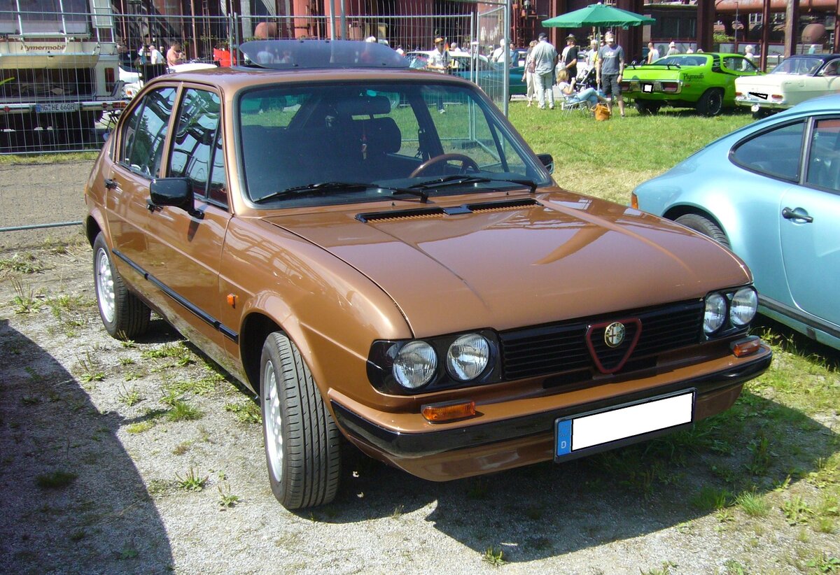 Alfa Romeo Alfasud 1.5ti der zweiten Serie, wie er von 1978 bis 1980 produziert wurde. Der Wagen mit Frontantrieb sollte die Alfa Romeo Produktpalette nach unten abrunden. Er wurde im Werk Pomigliano bei Neapel produziert. Dieses Werk wurde für die Produktion des Modelles erweitert, um im strukturschwachen Süditalien Arbeitsplätze zu schaffen. Allerdings wurde dieses Werk häufig bestreikt und durch anderweitige Arbeitsniederlegungen "lahm gelegt". Der abgelichtete Alfasud ist im Farbton marone di mane lackiert. Der Vierzylinderboxermotor hat im 1.5ti einen Hubraum von 1490 cm³ und leistet 84 PS. Oldtimer-Revival auf dem Gelände der Kokerei Zollverein in Essen am 10.08.2025.