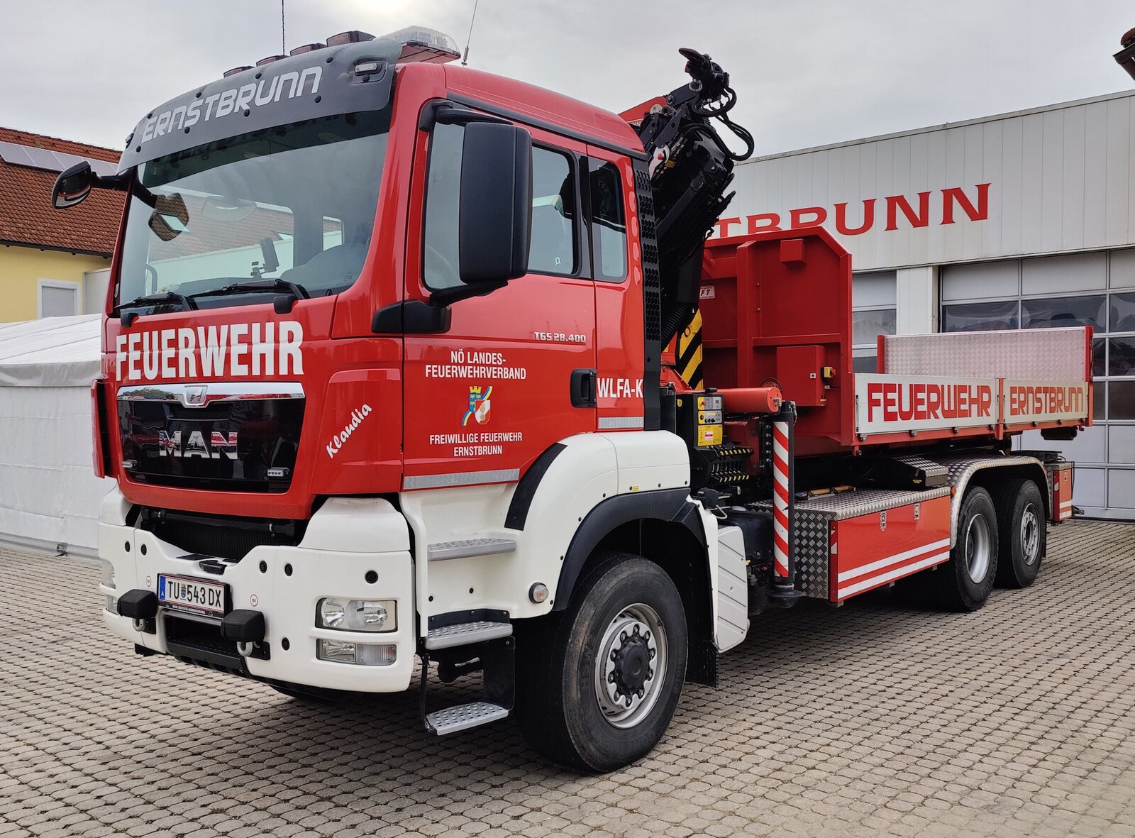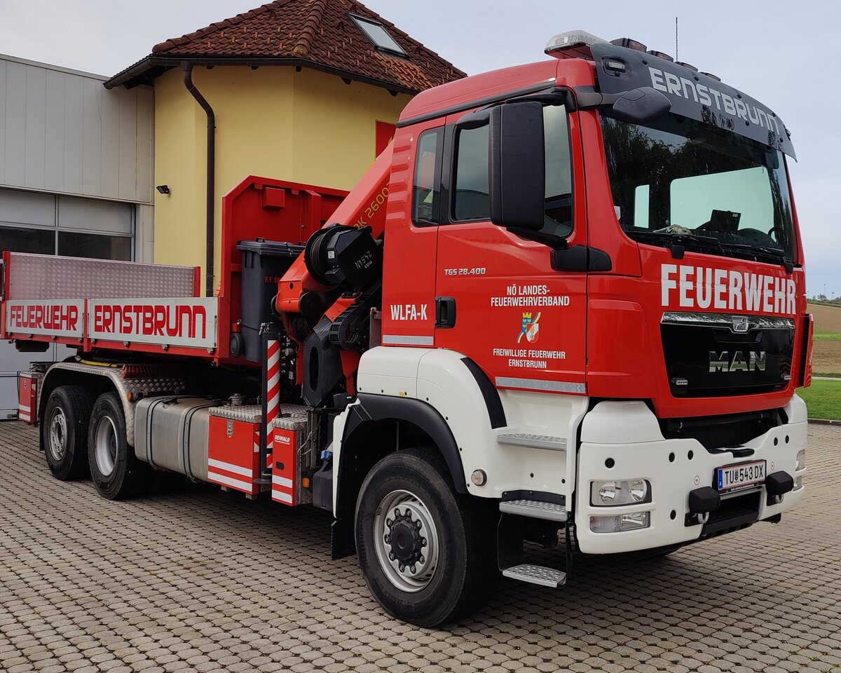Freiwillige Feuerwehr Ernstbrunn/Niederösterreich, WLFA-K Wechselladerfahrzeug-Kran, MAN 28.400 Allrad. Aufgenommen am 26.09.2024