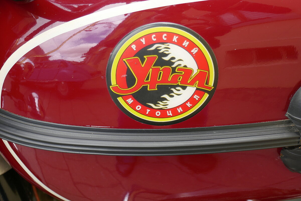 Ural Russisches Motorrad, steht auf dem Emblem am Tank dieser sowjetischen Maschine, Mai 2024