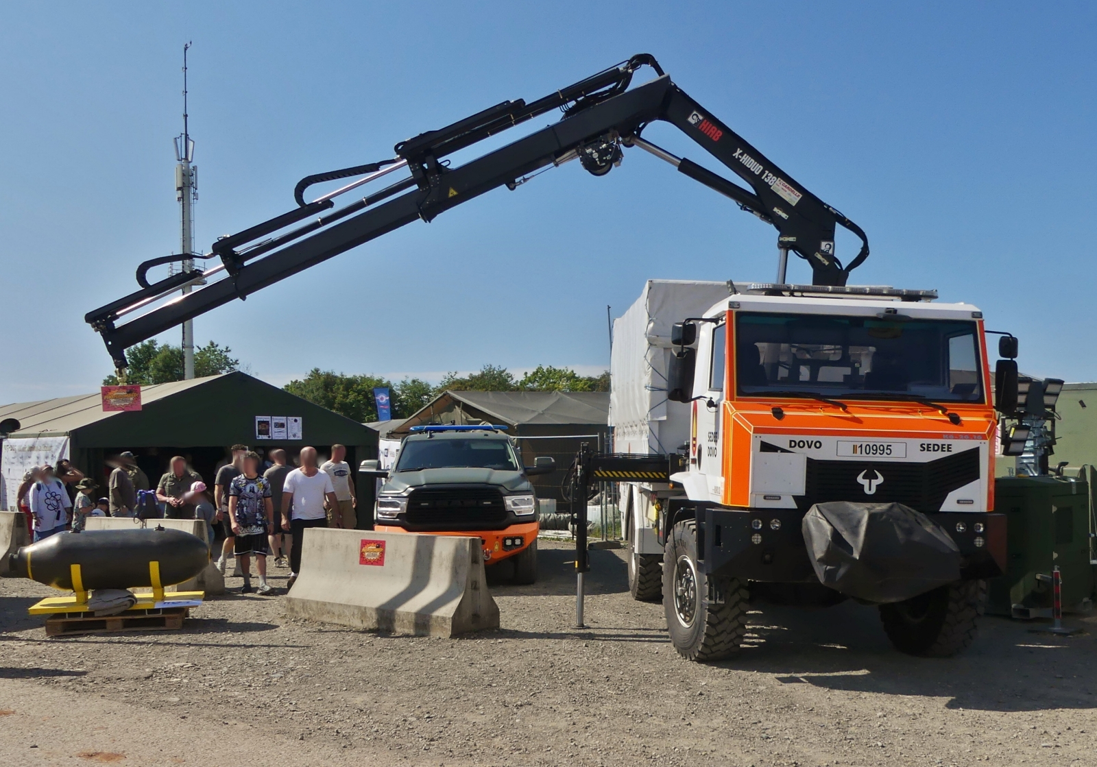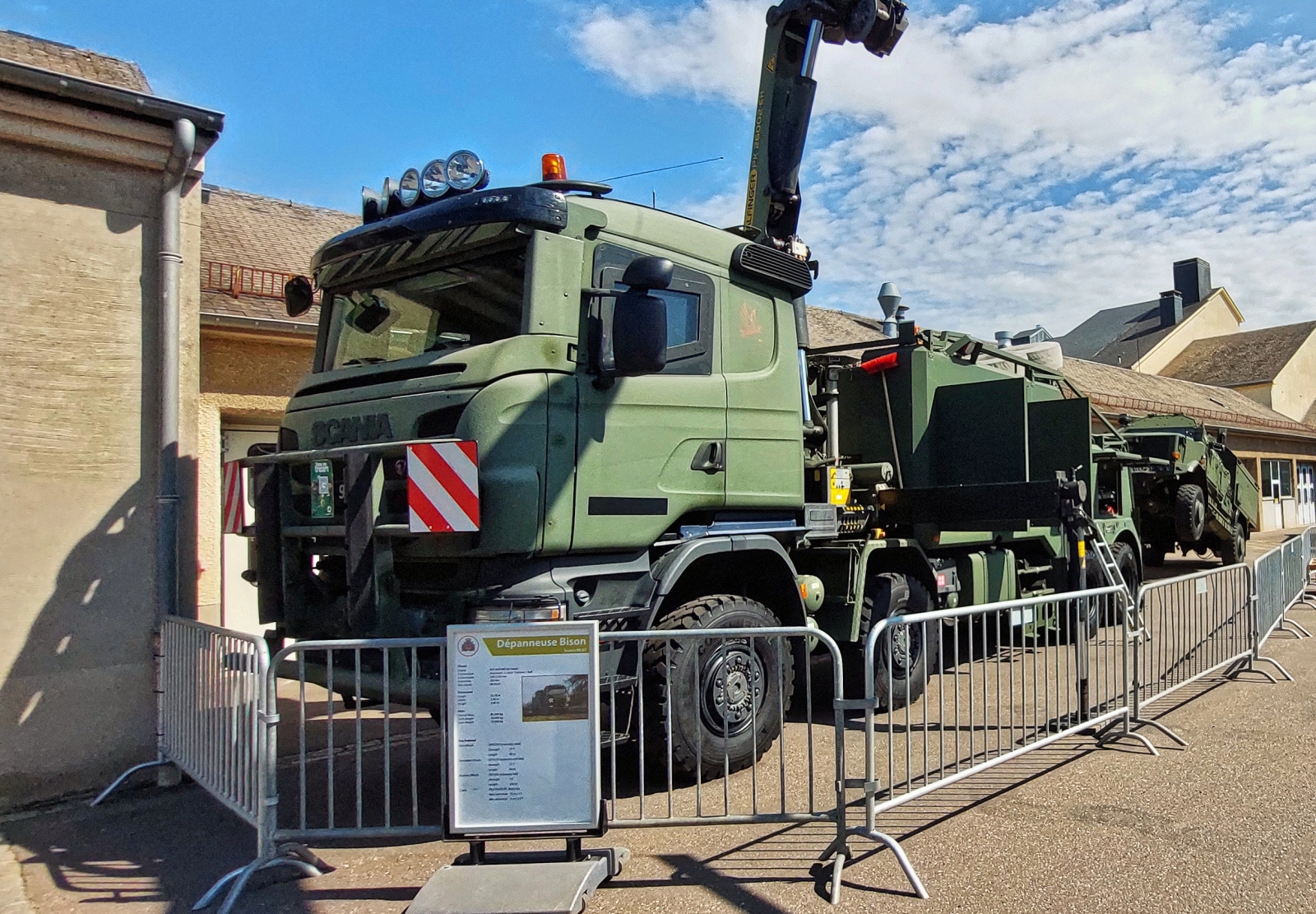 Gleich zwei Scania Lkws mit ausgefahrenem Kran, der luxemburgischen Armee, stehen am Eingang des Werkstattbereichs, gesehen am Tag der offenen Tür der luxemburgischen Armee. 13.07.2025