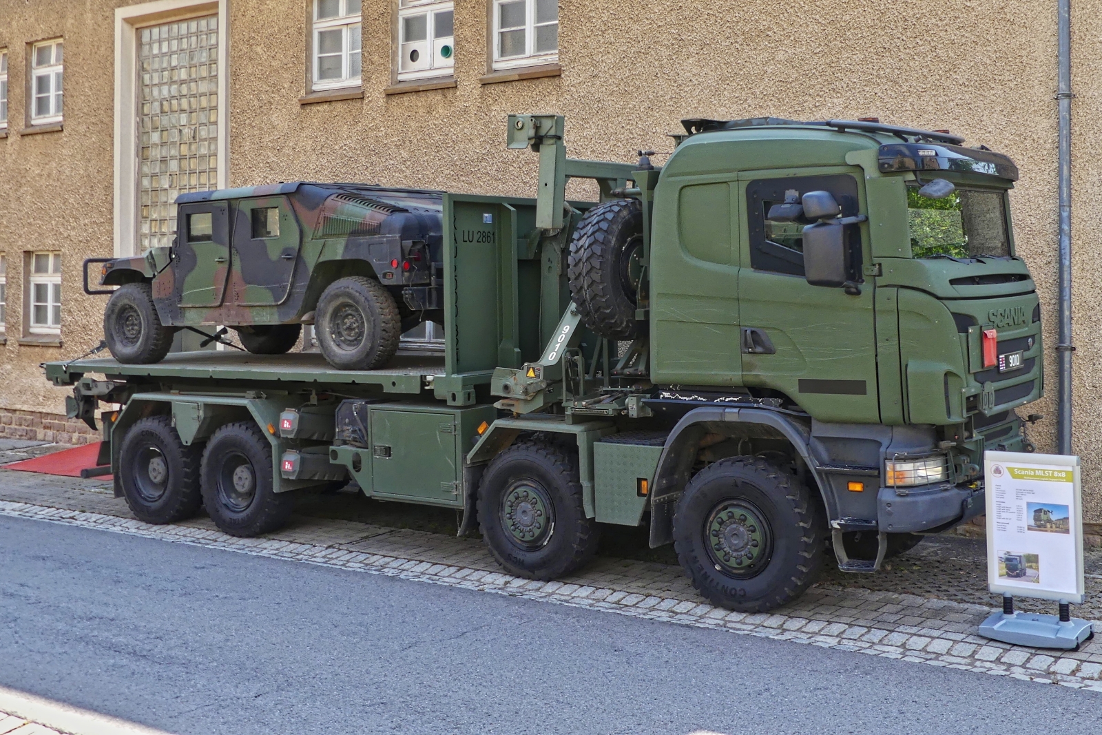 Scania Absetzkipper, Allrad, der luxemburgischen Armee, mit einem Hummer auf der Ladefläche, aufgenommen am Tag der offenen Tür der luxemburgischen Armee. 13.07.2025