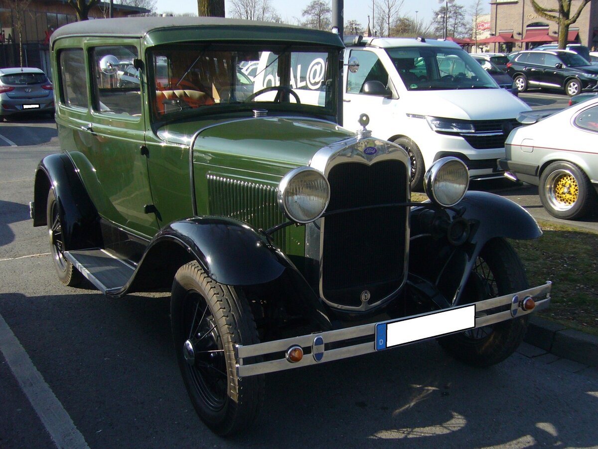 Ford Modell A Tudor, gebaut von 1928 bis 1931. Das Modell A war der Nachfolger des legendären Ford Model T. Während der vierjährigen Produktionszeit wurden 4.320.446 Einheiten in etlichen Karosserievarianten produziert. Der gezeigte Wagen stammt aus dem Modelljahr 1930 und ist im Farbton kewanee green lackiert. Der Vierzylinderreihenmotor hat einen Hubraum von 3285 cm³ und leistet 40 PS. Oldtimerbrunch am Cafe del sol in Gelsenkirchen am 09.03.2025.