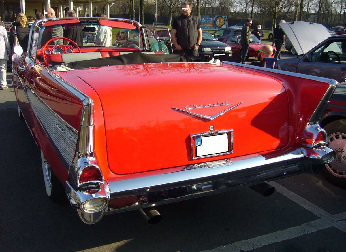 Chevrolet Series 2400C Bel Air Convertible Coupe des Modelljahres 1957. Von diesem Cabriolet Modell verkaufte die GM-Division Chevrolet im Jahr 1957 genau 47.562 Fahrzeuge. Der Basispreis lag bei US$ 2511,00. Der im Farbton matador red lackierte Bel Air, wird von einem V8-Motor angetrieben. Dieser, Turbo-Fire genannte Motor, leistet 185 PS aus einem Hubraum von 4635 cm³. Oldtimerbrunch am Cafe del sol in Gelsenkirchen am 09.03.2025.