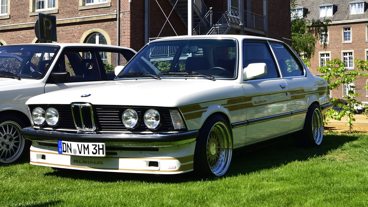 Alpine 3er BMW, E21, mitgezogen am 1. Mai 2025 auf der Zufahrt zum Oldtimer Frühlingserwachen beim Sportpark Loherhof Geilenkirchen