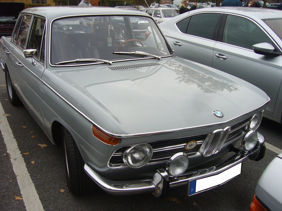 BMW 1800 Automatic, gebaut von 1963 bis 1971. Der BMW 1800 war, das am längsten gebaute Modell, der sogenannten "Neuen Klasse" von BMW. Der Vierzylinderreihenmotor hat serienmäßig einen Hubraum von 1773 cm³ und leistet, je nach Vergaserkonfiguration, 90 PS, 110 PS oder sogar 130 PS. Bei diesem Wagen dürfte es sich um ein Fahrzeug aus dem Modelljahr 1970 handeln, da danach eckige Frontscheinwerfer verbaut wurden. Oldtimertreffen am Cafe del Sol in Gelsenkirchen am 12.10.2025.