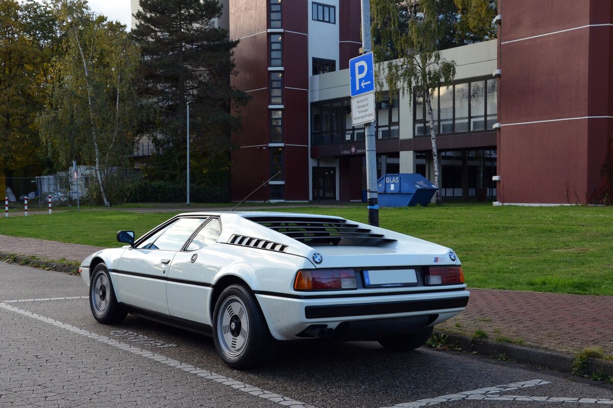 Heckansicht eines BMW E12 520i im Farbton chamonixweiß. Oldtimertreffen am Theater an der Niebu(h)rg am 19.10.2025 in Oberhausen/Rheinland.