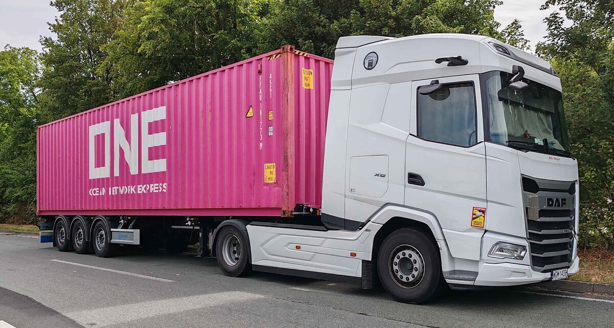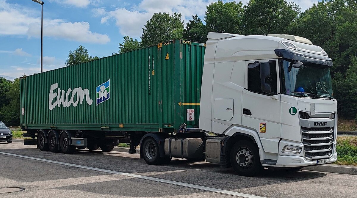 =DAF XG-Sattelzug transportiert einen Container von EUCON im Juli 2025